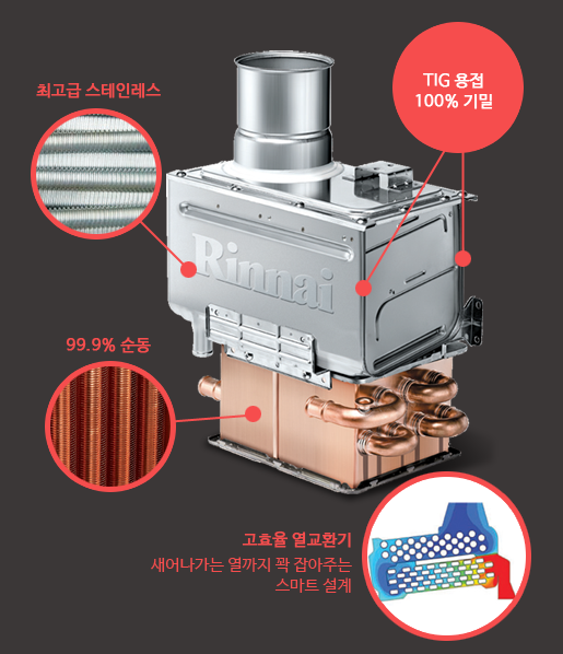 최고 열전도율의 순동 99.9% 1차 열교환기와 강산성 응축수에 강한 최고급 스테인레스 2차 열교환기, TIG 용접방식을 적용한 100% 기밀실현을 통해 가스비를 확실하게 잡았습니다.