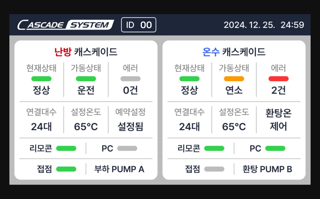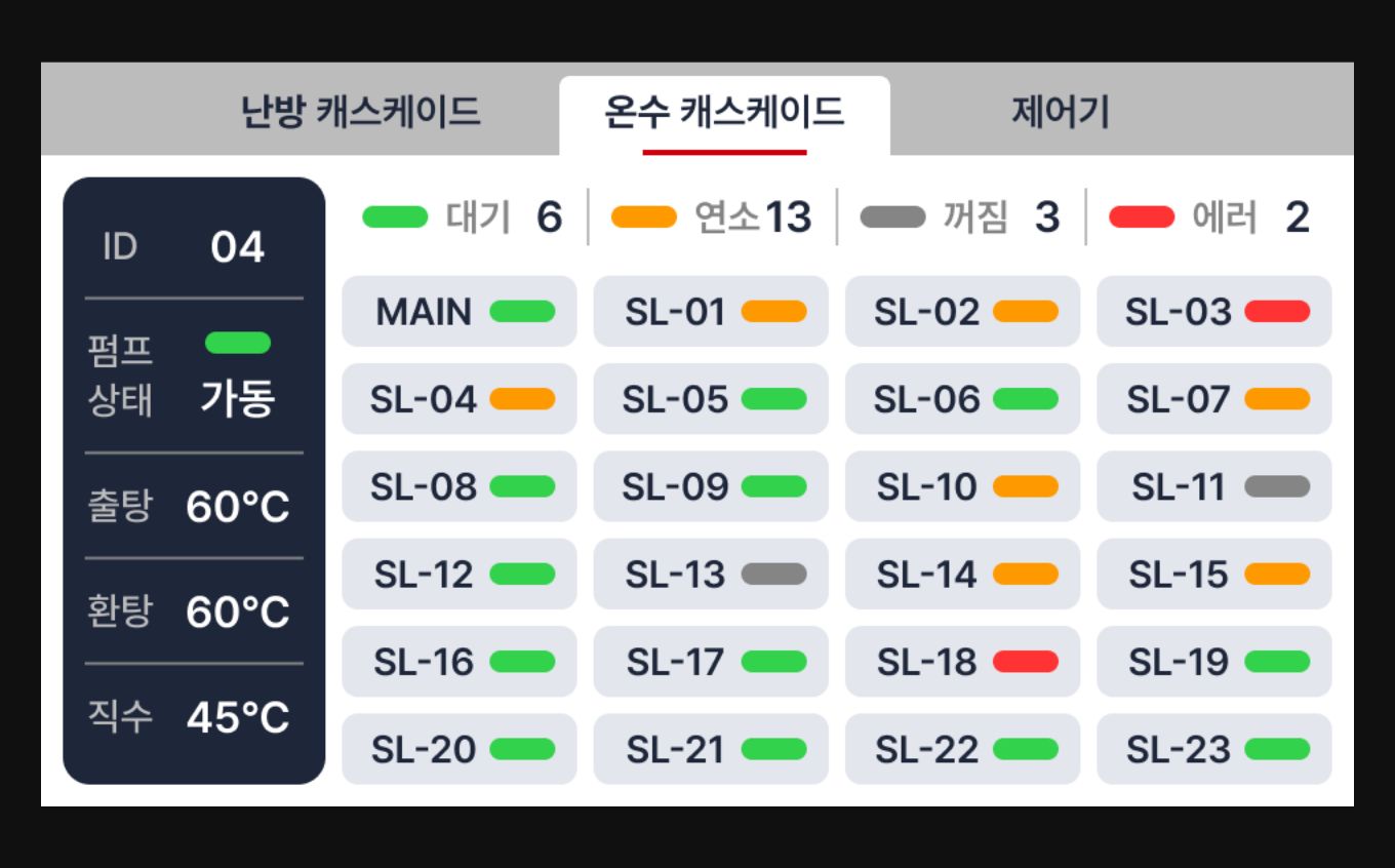 외부통신, 난방통신, 온수통신 (정상:녹색/이상:적색)