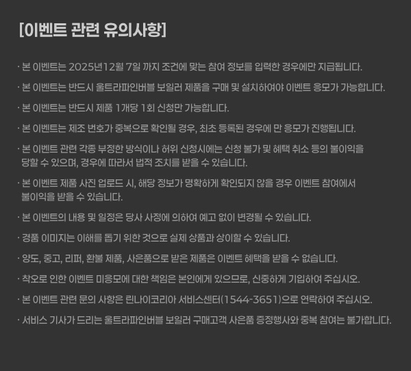 - 가정용을 업소용 및 차량,선박 등에 탑재하는 등 정상적인 사용환경이 아닌 곳에서 사용할 때에는해당 보증기간의 1/2 기간으로 적용합니다.