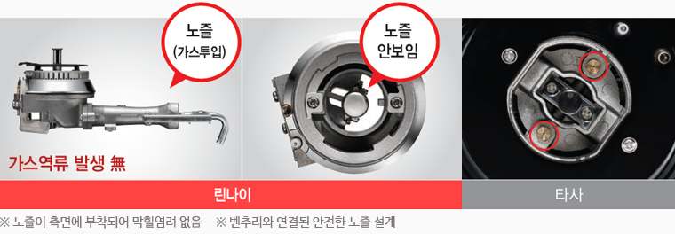 이물질로 인한 노즐막힘 걱정이 없어 안전합니다. ※ 가스 역류시 화재의 위험이 있습니다.