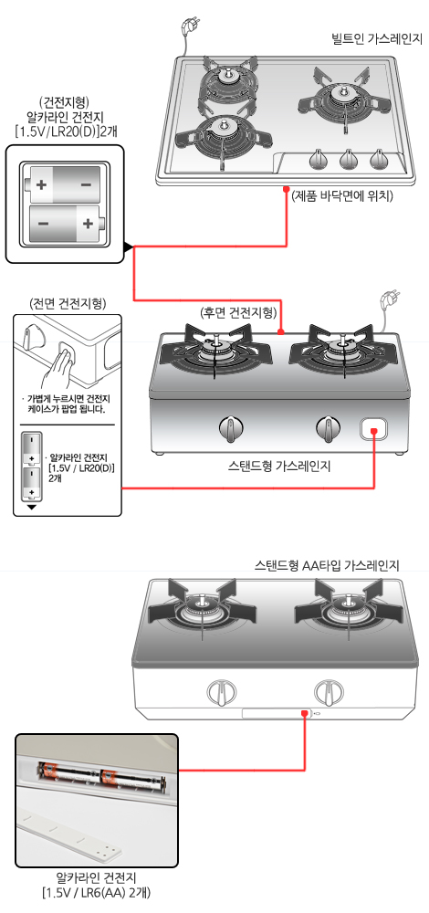 ·건전지는 알카라인건전지, 망간건전지 두 종류가 있는데 가스레인지에는 알카라인 건전지가 더 적합합니다.